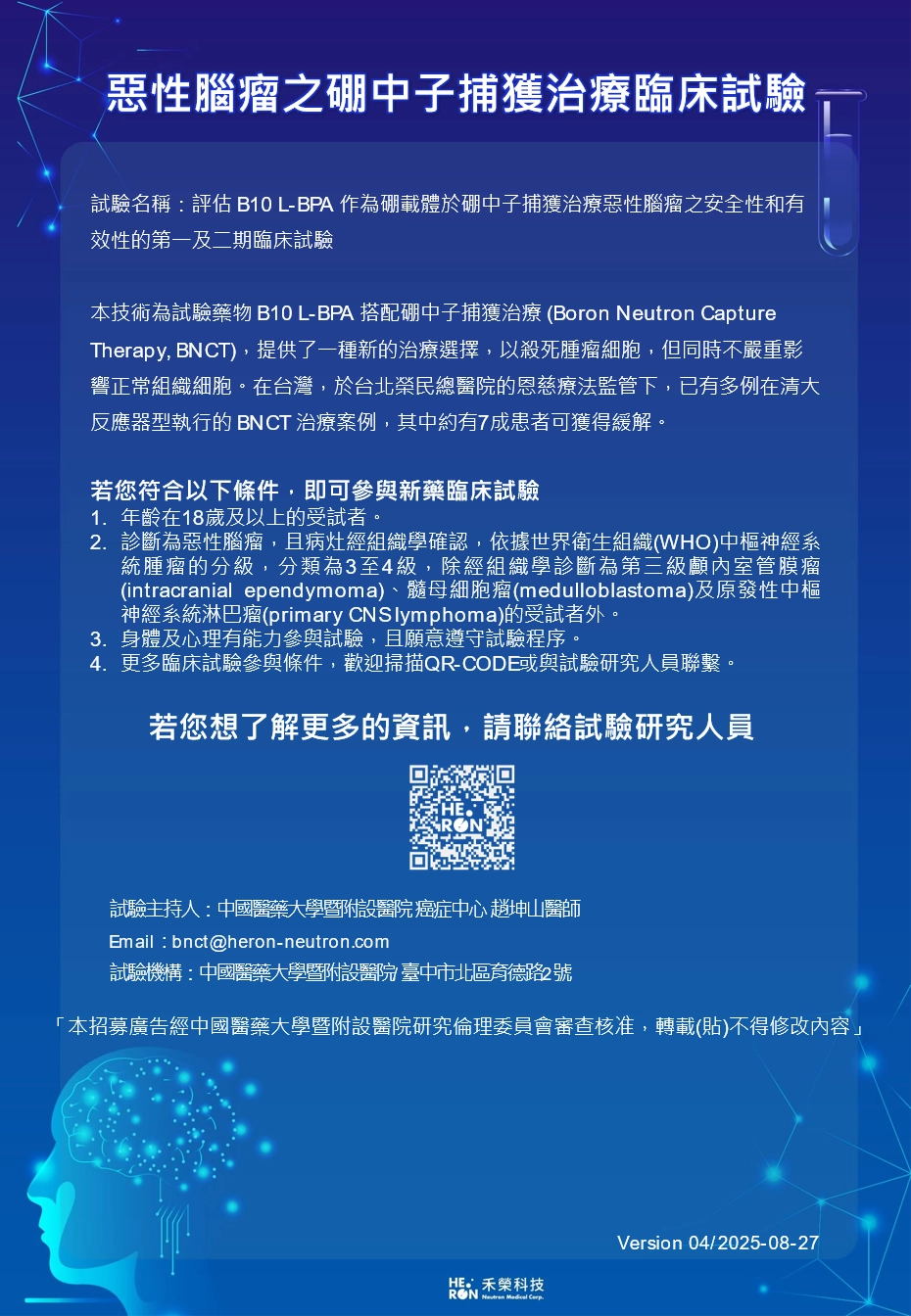 (21)受試者先前接受過BNCT治療。 試驗計畫聯絡資訊:bnct@heron-neutron.com本試驗預計收納受試者人數:10位符合資格(最多10位可評估)的受試者。